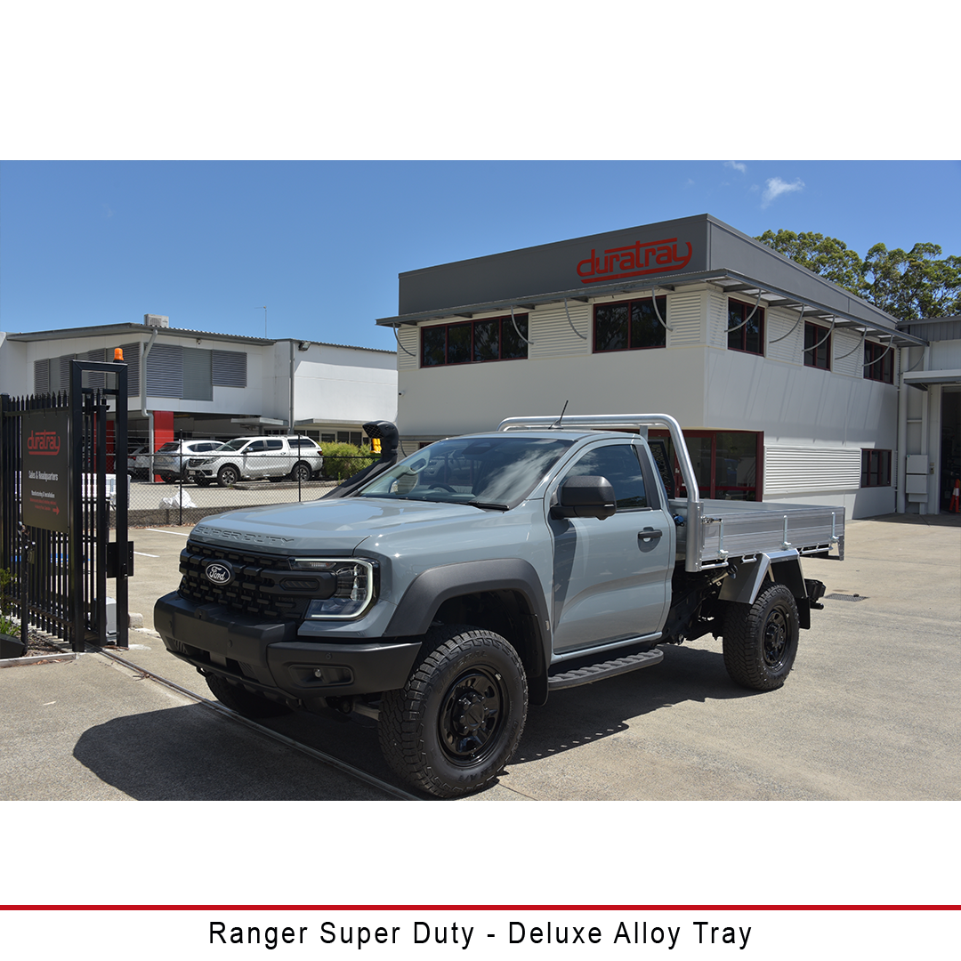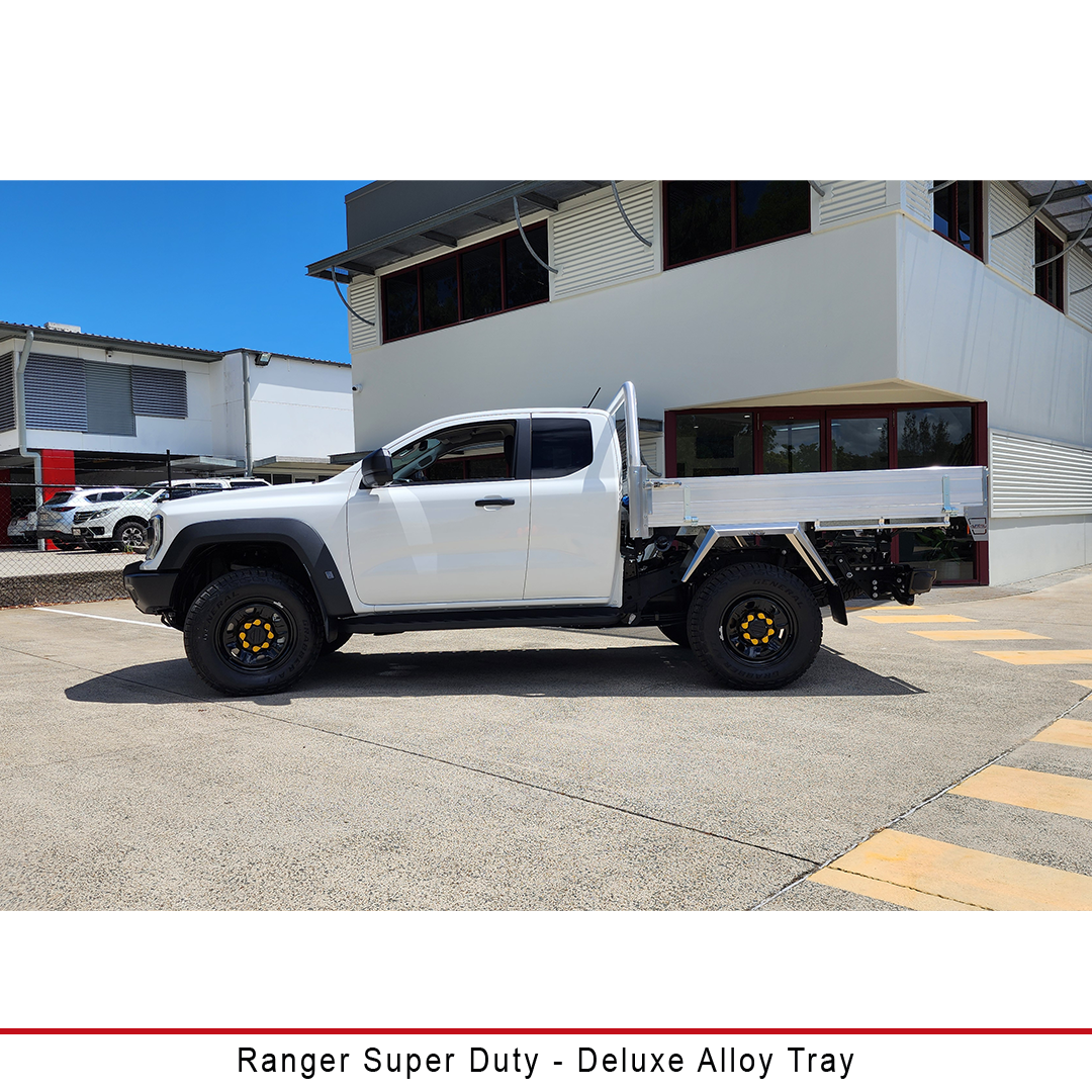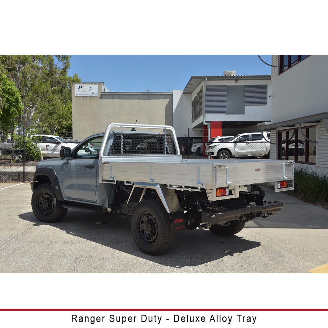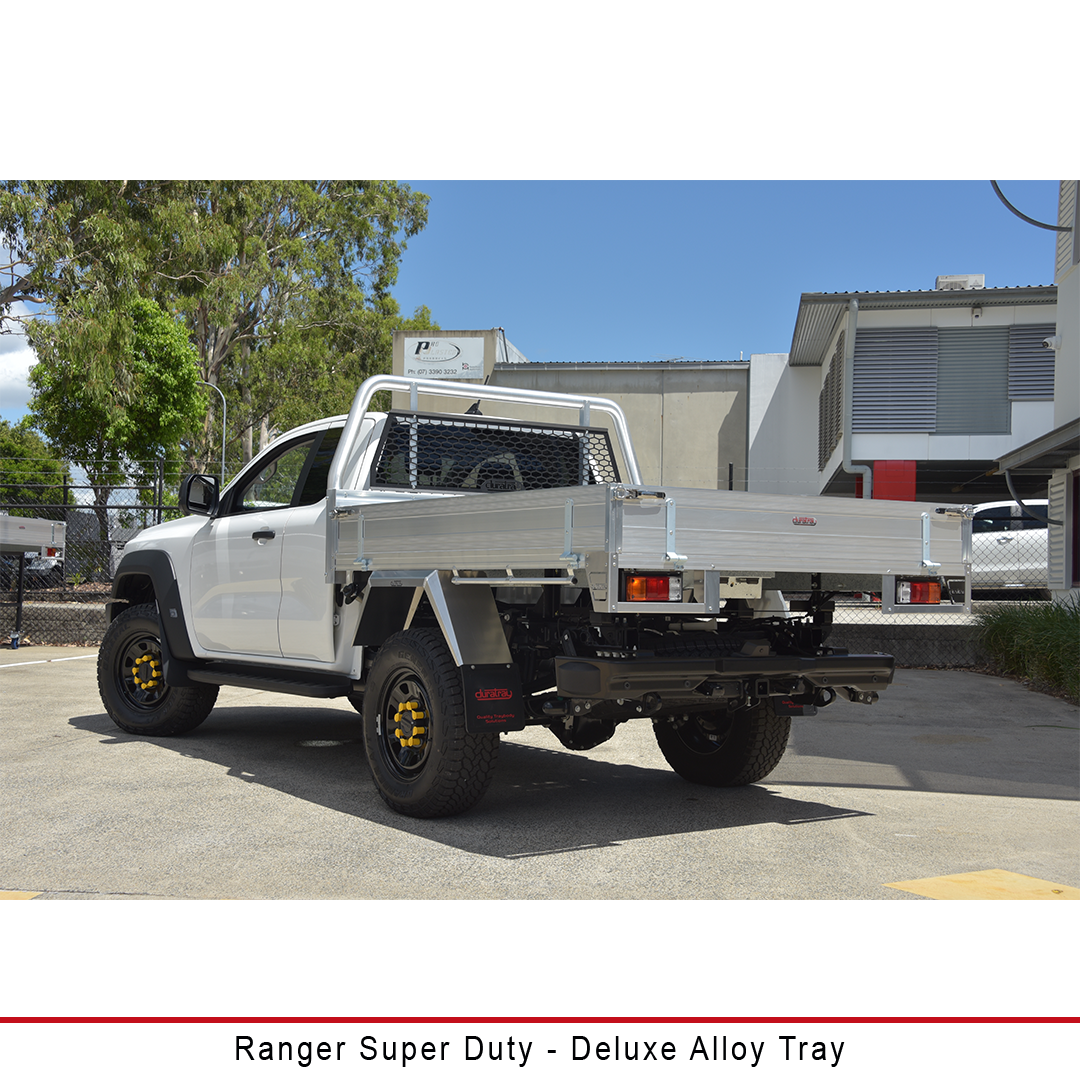 The Super Duty compatible Deluxe Aluminium Tray combines premium features with a heavy-duty product for those that require a great looking tray that is ready for hard work. Standard features include 76mm tubular headboard, laser-cut steel window protection, one-piece flared mudguards & tail light...