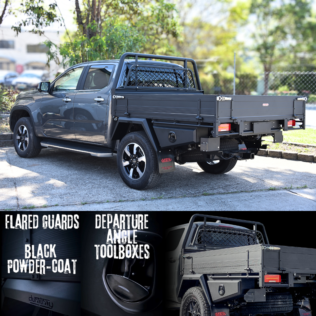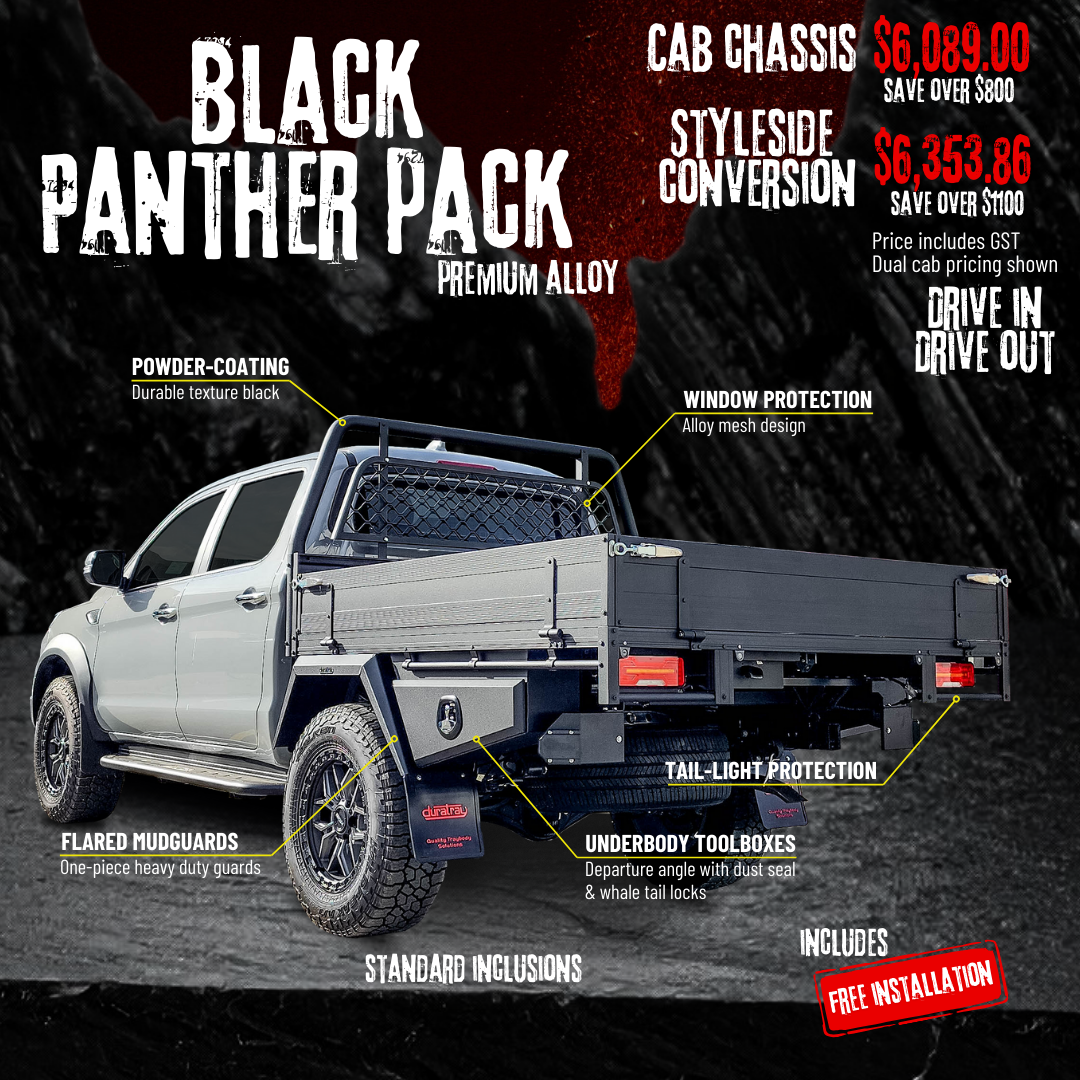 Based on the ever-popular Oz Panther Premium alloy tray, our Black Panther Pack is designed to stand out from the crowd, without breaking the budget. The one-piece flared mudguards not only look great but allow fitment of larger offset aftermarket wheels and can be adjusted or inverted to suit any vehicle. The tapered departure angle toolboxes provide additional storage without compromising offroad clearance. We have included window & tail-light protection as standard and finished it all off in a durable Texture Black powder coat.