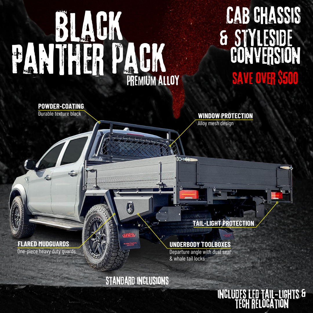 Based on the ever-popular Oz Panther Premium alloy tray, our Black Panther Pack is designed to stand out from the crowd, without breaking the budget. The one-piece flared mudguards not only look great but allow fitment of larger offset aftermarket wheels and can be adjusted or inverted to suit any vehicle. The tapered departure angle toolboxes provide additional storage without compromising offroad clearance. We have included window & tail-light protection as standard and finished it all off in a durable Texture Black powder-coat.