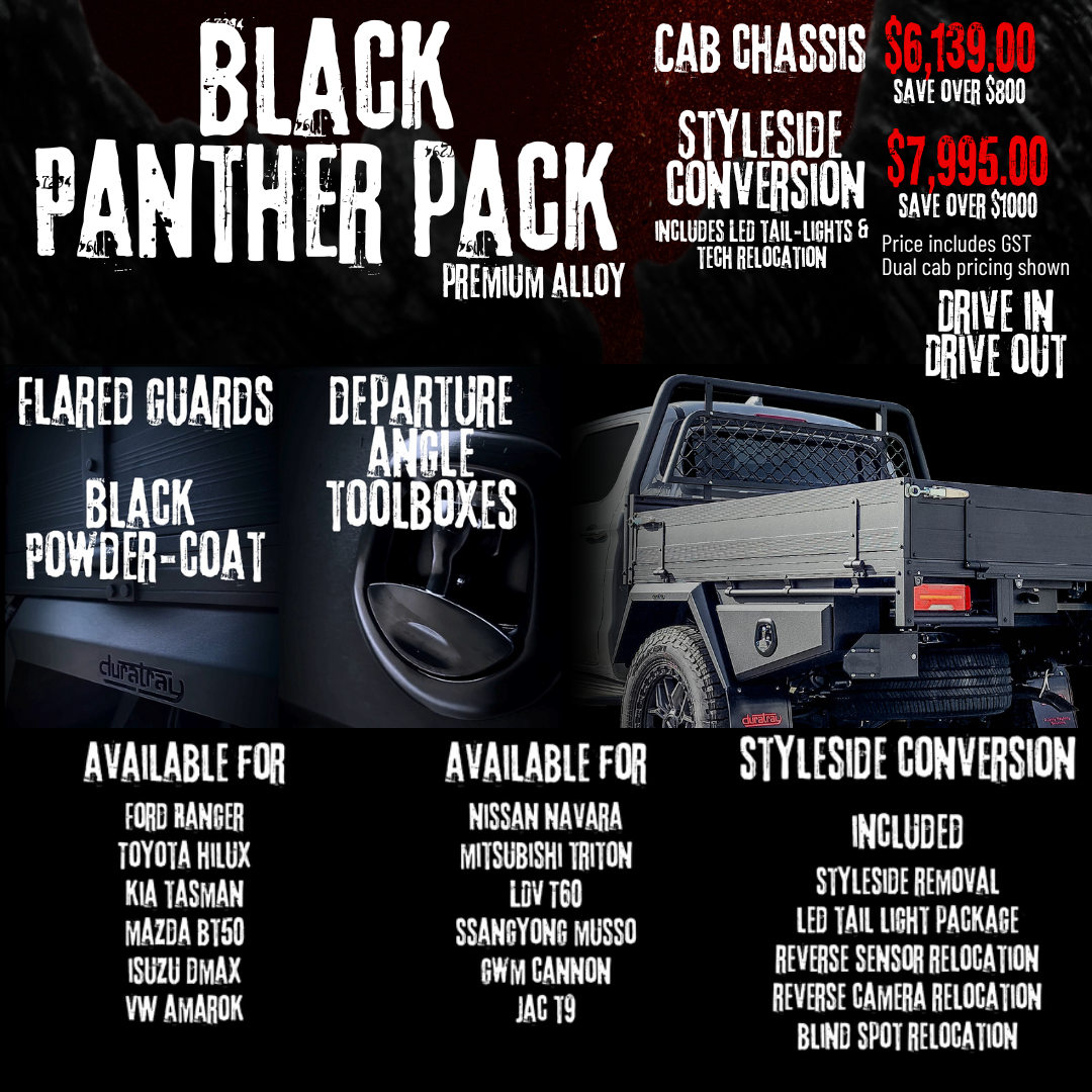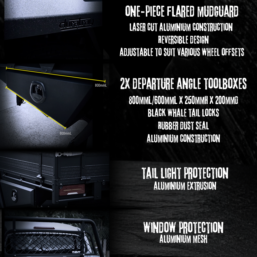 Based on the ever-popular Oz Panther Premium alloy tray, our Black Panther Pack is designed to stand out from the crowd, without breaking the budget. The one-piece flared mudguards not only look great but allow fitment of larger offset aftermarket wheels and can be adjusted or inverted to suit any vehicle. The tapered departure angle toolboxes provide additional storage without compromising offroad clearance. We have included window & tail-light protection as standard and finished it all off in a durable Texture Black powder-coat. Available for a limited time only!