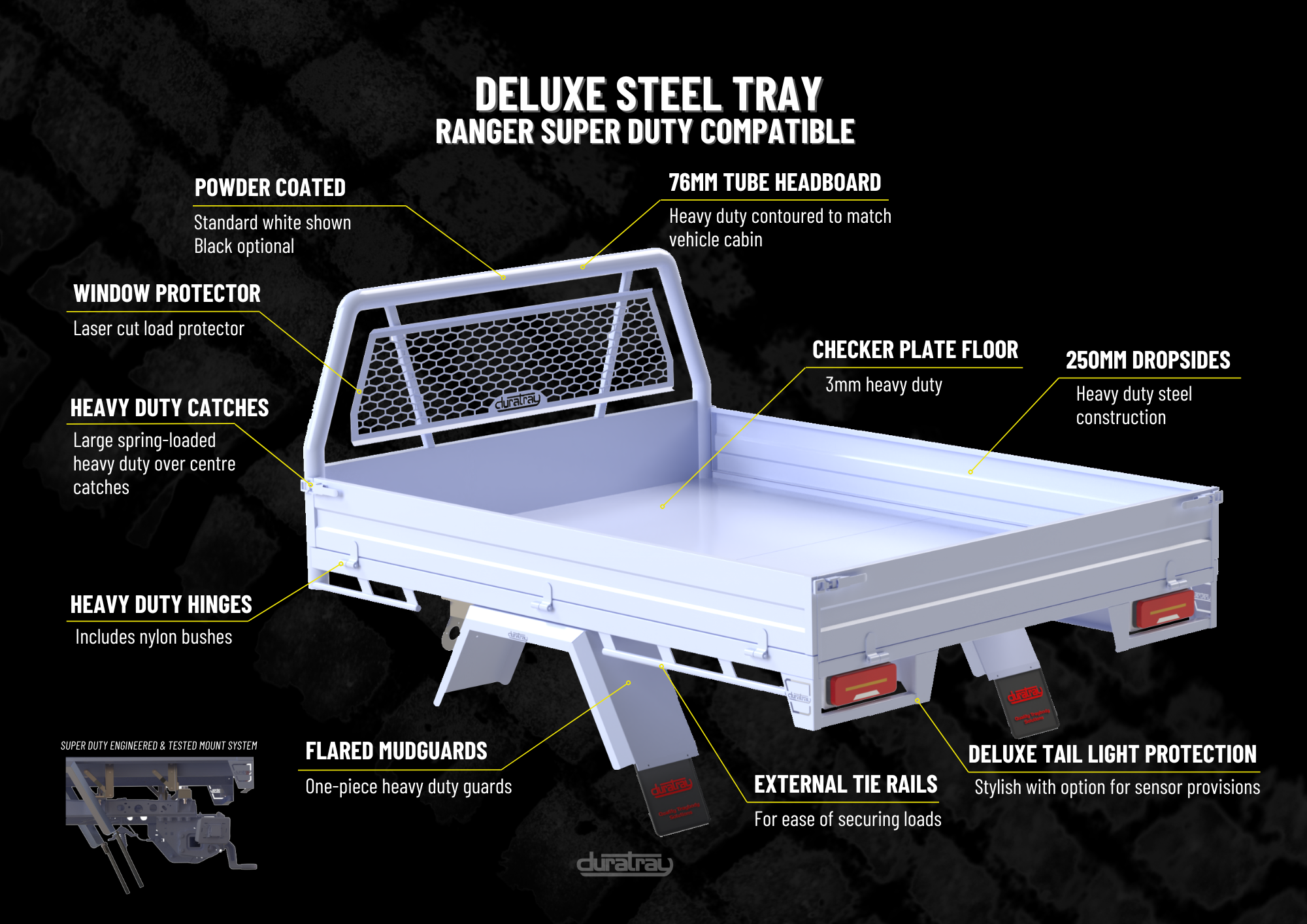 The Super Duty compatible Deluxe Steel is a fully welded, heavy-duty steel tray designed to be eye catching and able to withstand the harsh Australian conditions....