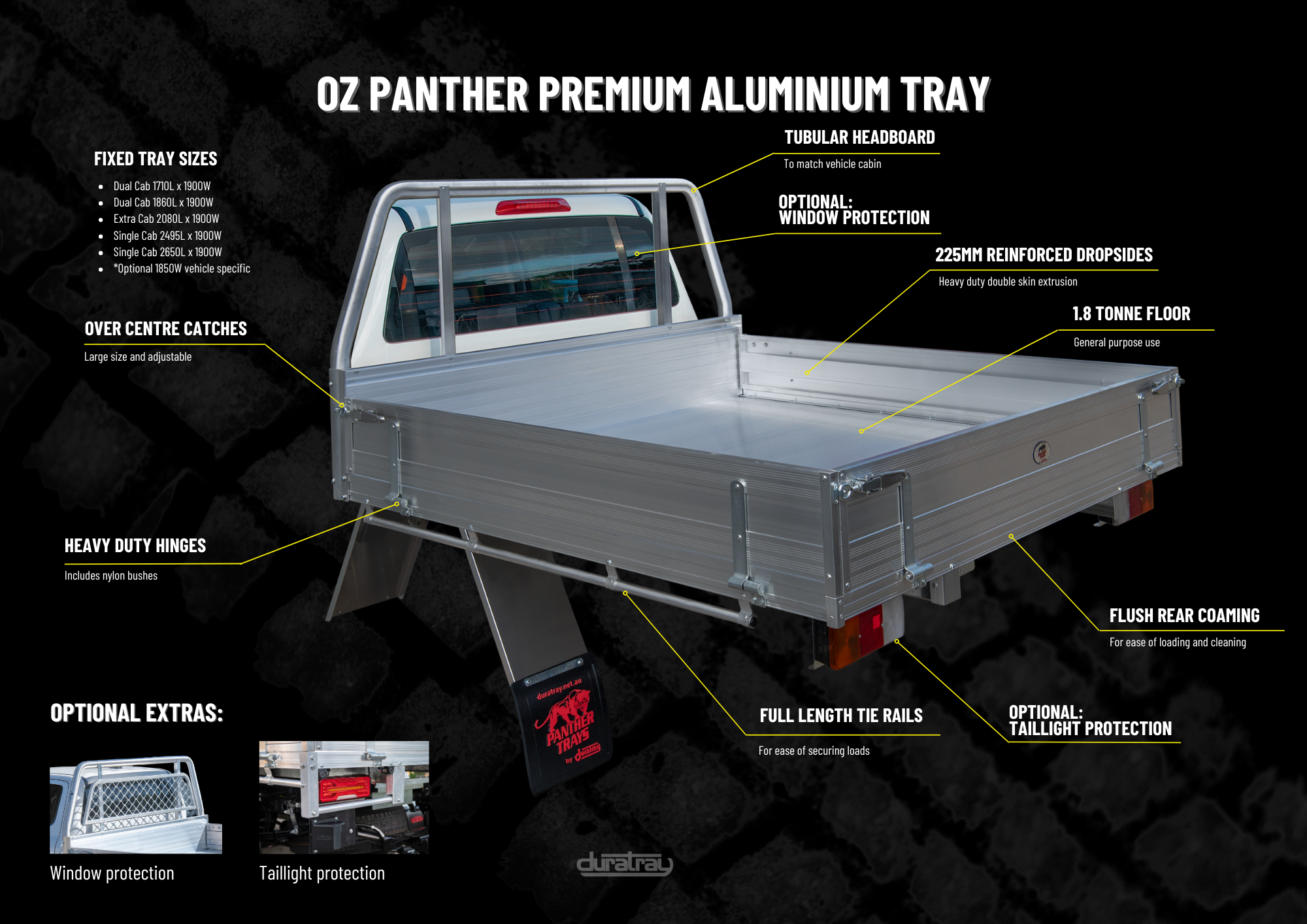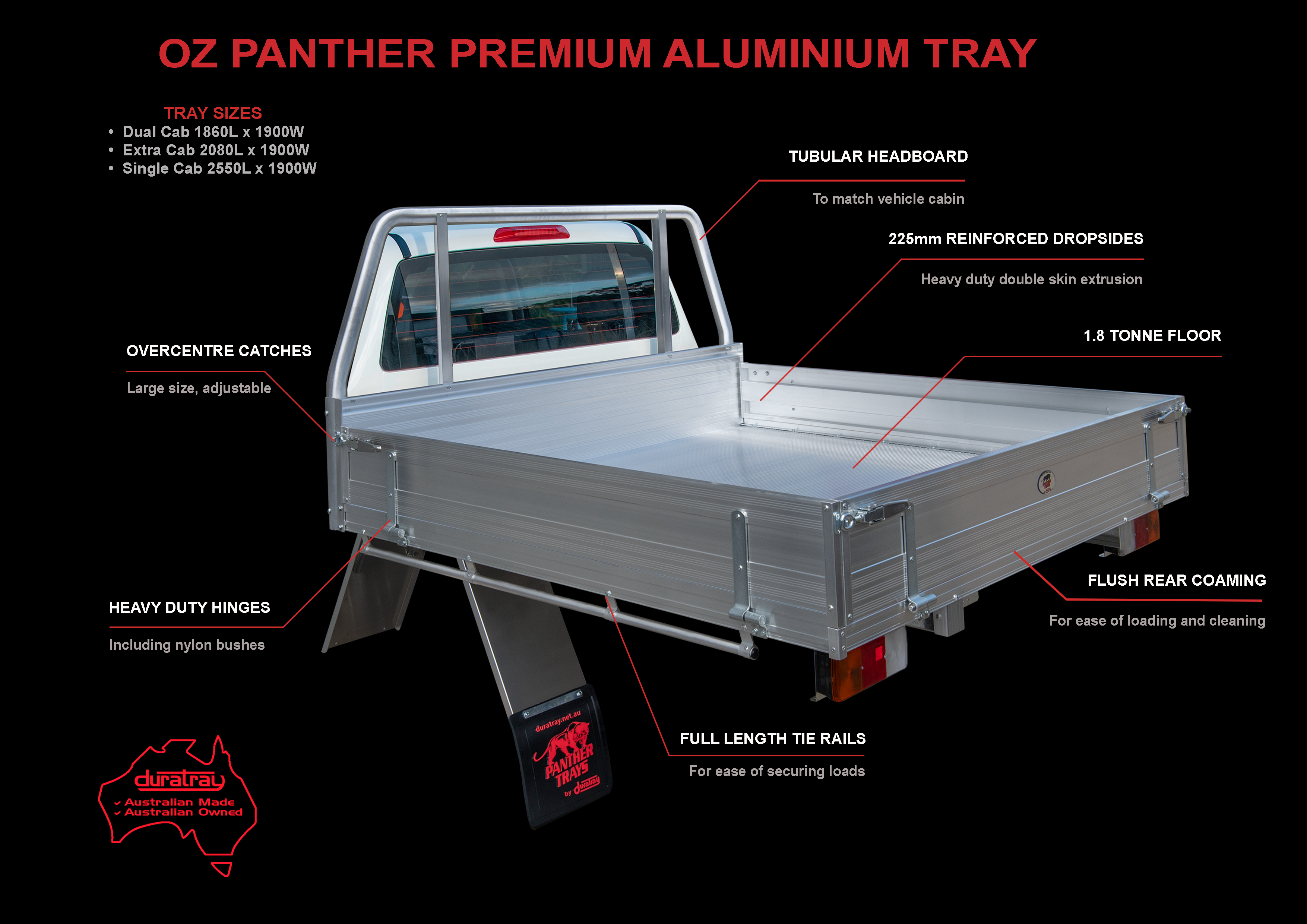 The Oz Panther Premium Aluminium Tray is an entry-level, high-quality Aluminium Tray Body at an affordable price now with the addition of a Tube Headboard. These trays are locally manufactured and available for quick delivery!
